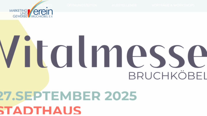 Vitalmesse Bruchköbel – Gesundheit im Fokus ✨Samstag, 27. September 2025 | 10:00 – 18:00 Uhr | Stadthaus Bruchköbel Der Marketing- und Gewerbeverein Bruchköbel lädt herzlich zur ersten Vitalmesse ein!Unter dem Motto „Vorbeikommen, mitmachen, wohlfühlen“ erwartet Sie ein Tag voller Energie, Inspiration und wertvoller Impulse für ein gesundes, aktives Leben – und das bei freiem Eintritt. Das erwartet Sie: Spannende Aussteller aus Medizin, Fitness, Ernährung, Pflege & Wellness Mitmachangebote & Gesundheits-Checks Workshops & inspirierende Vorträge Regionale Sportvereine und engagierte Gesundheits-Akteure Viele Anregungen für mehr Lebensqualität – in jedem Alter Ob Sie neue Ideen für Ihren Alltag suchen, Ihr Wohlbefinden steigern möchten oder einfach Lust haben, sich inspirieren zu lassen: Die Vitalmesse bietet Ihnen zahlreiche Möglichkeiten, direkt vor Ort aktiv zu werden und wertvolle Kontakte zu knüpfen.  Weitere Informationen zu Programm und Ausstellern finden Sie auf der Website des Marketing- und Gewerbevereins Bruchköbel. Barbara Schadeberg – https://mgv-bruchkoebel.de/vitalmesse/